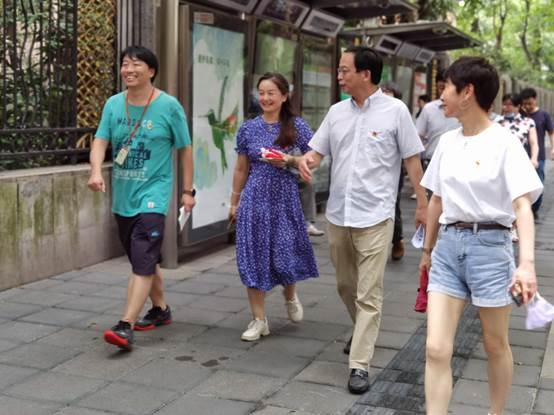 中心所在的天平街道,歷史底蘊和文化內涵深厚,紅色基因得天獨厚,曾是中國共產黨和廣大社會進步人士早期在上海從事革命活動的重要區域之一,有著梧桐深處最美黨建圈的美譽。下午四點,同志們從岳陽路出發,沿建國西路、襄陽南路、永嘉路、嘉善路、復興中路、烏魯木齊南路在梧桐樹下漫步,走訪了“中共地下秘密電臺舊址”、“馬敘倫舊居”、“南國藝術學院舊址”、“張瀾舊居”、“中共江蘇省委機關舊址”、“新四軍駐上海辦事處舊址”、“錢壯飛舊居”、“瞿秋白舊居”和“上海徐匯藝術館”九個紅色場所。
