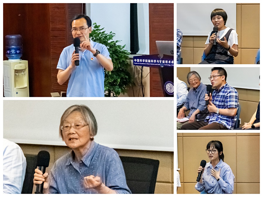 在座談交流環節,在黨委委員何杰的主持下,曾任中科院上海腦研究所副所長、黨總支書記、上海實驗動物中心主任的洪慕祁與湯章城、張凱以及腦智卓越中心黨委委員何杰研究員、黨支部書記徐春研究員、黨支部書記竺淑佳研究員、剛剛回國入職的汪菲研究員等,圍繞“我心目中的科學家精神”展開了座談交流。