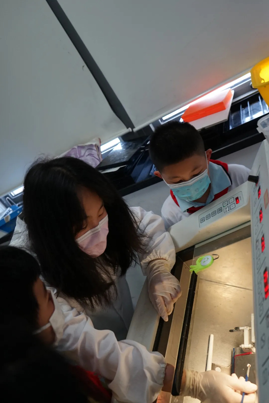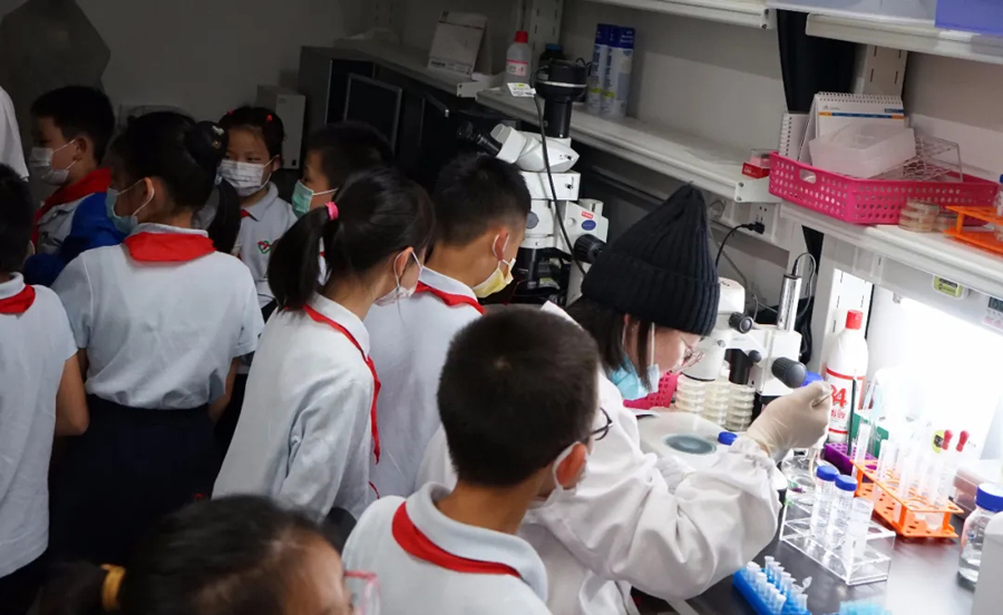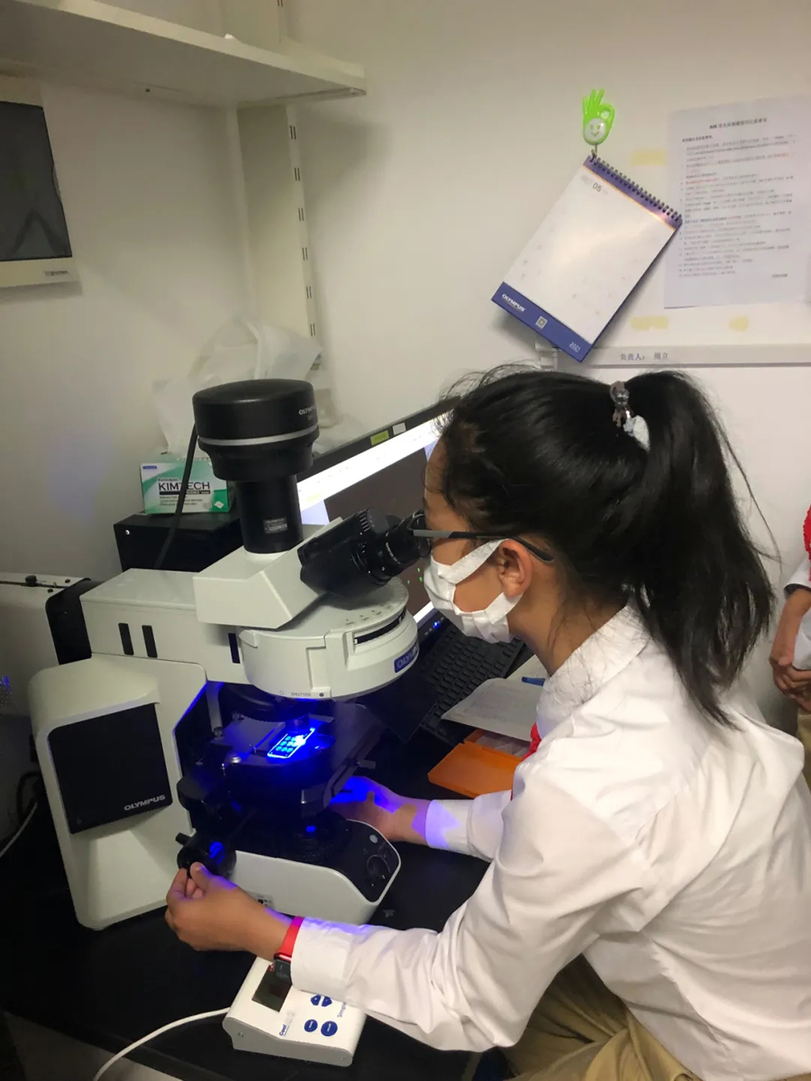 在強調了實驗室安全規范后,科普志愿者將參觀者分為多個小組,帶領他們比較了不同年齡階段線蟲的運動狀態、年輕小鼠與年老小鼠的差異,熟悉了斑馬魚的胚胎發育過程,辨別了斑馬魚的雌雄差異,講解了各種儀器設備的用途,展示了通過光遺傳方法控制小鼠癢覺的過程,并讓他們近距離地觀察了小鼠大腦、斑馬魚的顯微注射和熒光篩選技術。同學們對熒光蛋白在生物學領域的應用有了一個初步的了解,在看到標記有熒光信號的五顏六色的轉基因魚系時,他們表現出對從事科研的向往之情。