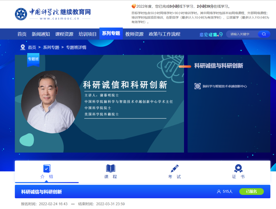 為進(jìn)一步強(qiáng)化全體科研人員科研誠信意識(shí),中科院腦智卓越中心在2月25日至3月31日期間,以中科院繼續(xù)教育網(wǎng)專題班方式組織開展了“科研誠信與科研創(chuàng)新”線上培訓(xùn),210名科研人員參加了在線學(xué)習(xí),累計(jì)604學(xué)時(shí)。