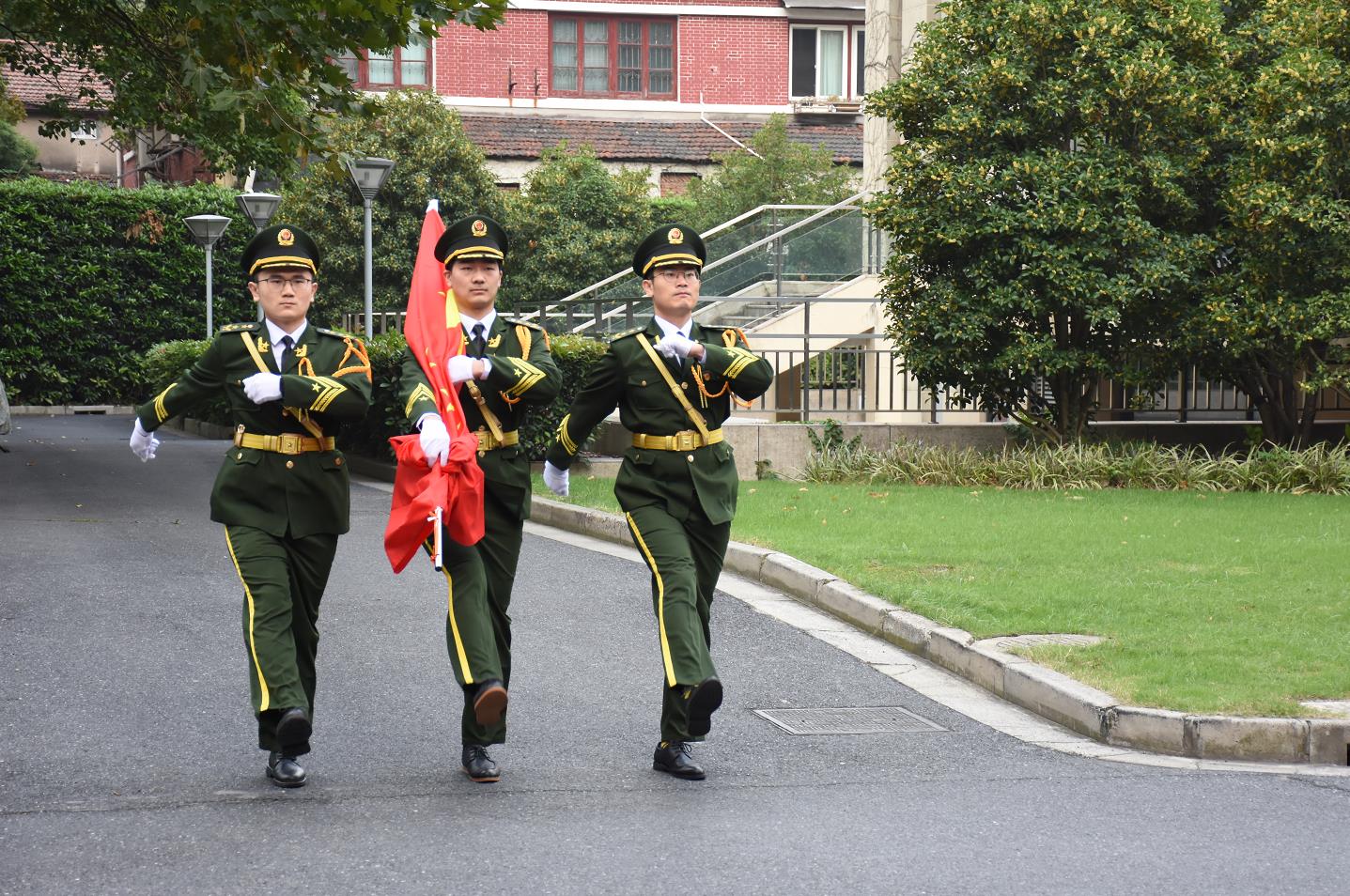 “請升旗手就位。出旗!”。在“一二一”的嘹亮口令聲中,由二支部三名黨員組成的國旗隊護送,踢著邁著矯健有力的正步,英姿颯爽,把鮮艷的五星紅旗護送至升旗臺。
