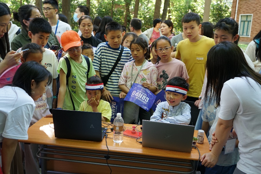 ????5月18日下午,在“腦智擘未來”科普市集上,近千名中小學(xué)生及陪同家長體驗了腦電協(xié)作、腦電對抗、眼控避障、腦功能水平測試、假手錯覺、斑馬魚的裙擺等6個生動有趣的科普實驗,系列實驗由腦智卓越中心科普協(xié)會和相關(guān)實驗室根據(jù)日常科學(xué)實驗和最新科研成果原創(chuàng)制作而成,實驗充分結(jié)合公眾對社交化、娛樂化、游戲化等科普內(nèi)容的偏好,將日常看不見、摸不著、感受不到的腦電、眼電信號,采取信息化手段和趣味性比賽、協(xié)同合作等方式呈現(xiàn)出來,使得曾經(jīng)“高冷”的專業(yè)操作,以更多元、更新潮的方式綻放科學(xué)的魅力,體驗現(xiàn)場充滿了緊張與期待、驚奇與歡笑。