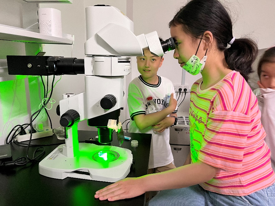 ????在強調(diào)了實驗室安全規(guī)范后,科普志愿者將參觀者分為多個小組,帶領(lǐng)他們比較了不同年齡階段線蟲的運動狀態(tài),解讀了神經(jīng)元投射圖譜的繪制過程,展示了小鼠的聽力差異,并讓他們近距離地觀察斑馬魚一生成長的歷程。同學(xué)們對熒光蛋白在生物學(xué)領(lǐng)域的應(yīng)用有了一個初步的了解,在看到標(biāo)記有熒光信號的五顏六色的神經(jīng)組織時,他們表現(xiàn)出對從事科研的向往之情。