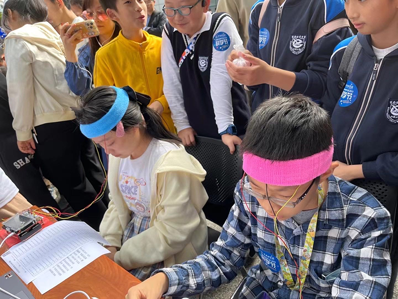 在科普市集上,蔡時(shí)青研究組、劉靜宇研究組為社會(huì)公眾提供了“腦電對(duì)抗”實(shí)驗(yàn),將日常看不見、摸不著、感受不到的腦電信號(hào),以信息化手段真實(shí)呈現(xiàn)出來。