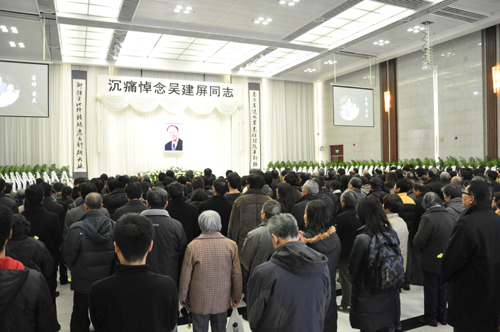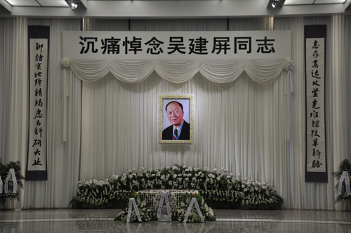 告別儀式大廳里莊嚴肅穆。“志存高遠 攻堅克難探改革新路,腳踏實地 殫精竭慮為科研大業”巨幅挽聯懸掛兩旁,左右兩個大屏幕滾動播放著吳建屏先生的紀念短片。