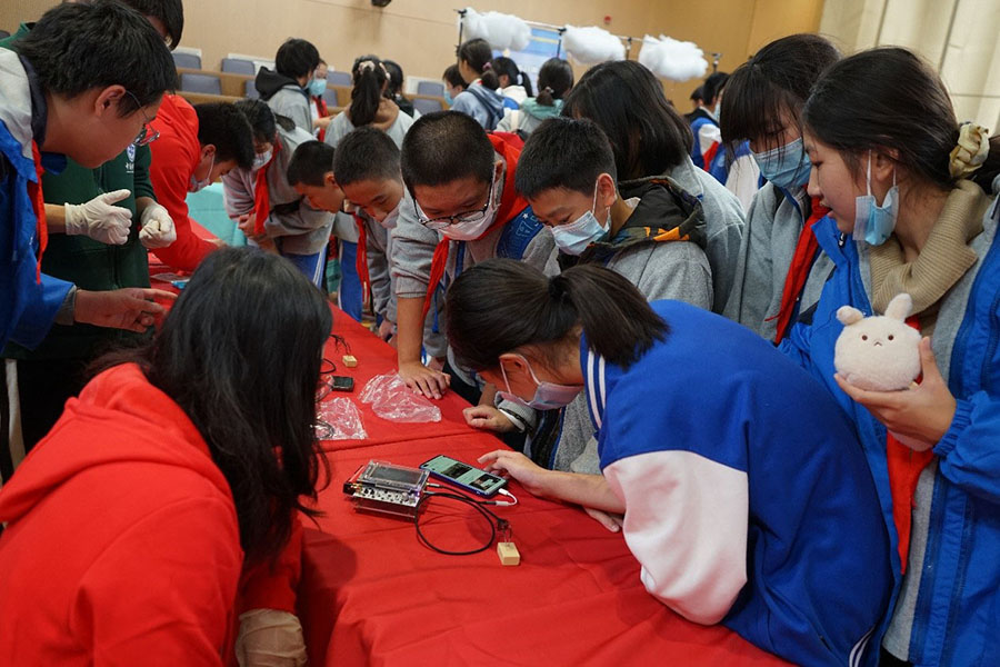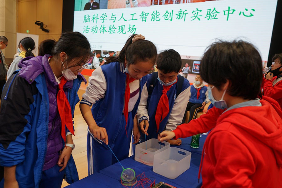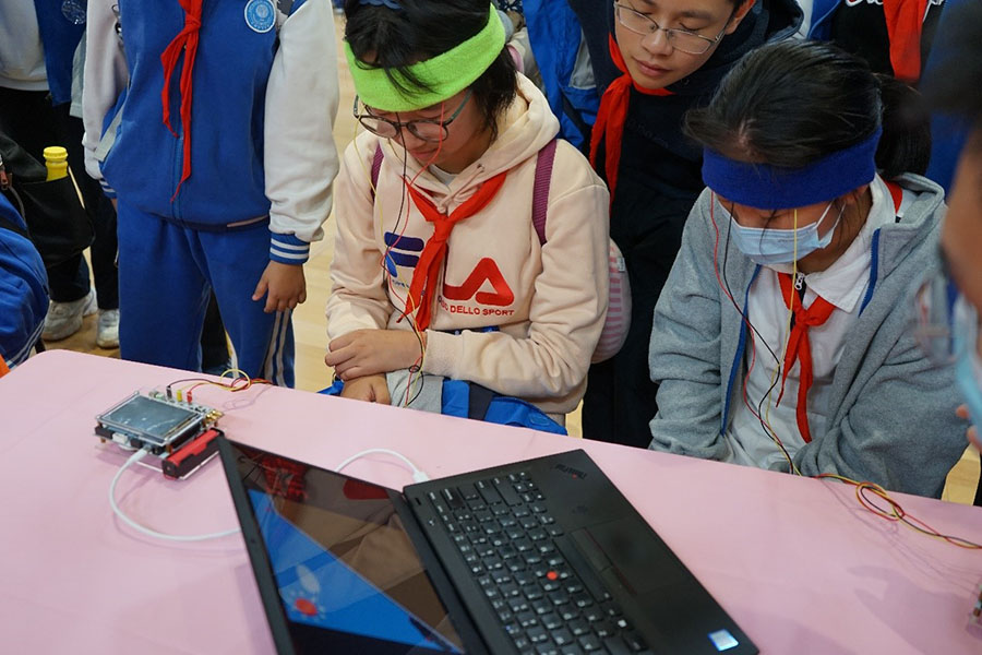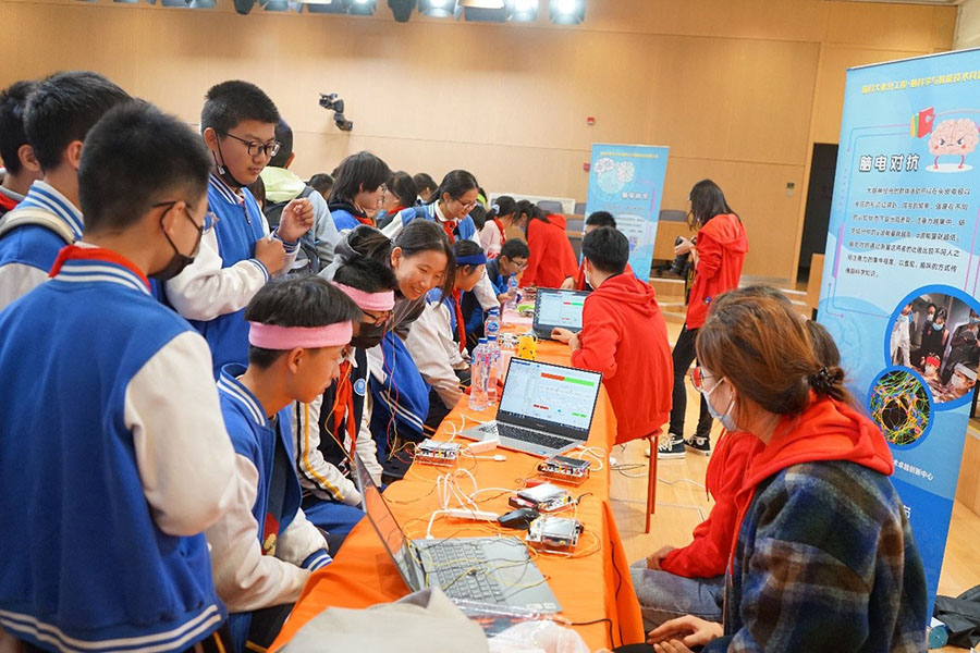 10日下午,上海中學腦科學與人工智能創新實驗中心分批有序地組織了330多名中學生前往活動現場15個科普實踐點,依次體驗了僵尸跳舞、腦電對抗、腦電協作、力量召喚閃電、斑馬魚的裙擺等趣味小實驗。此次腦科學與智能技術科普行動融科學性、教育性、體驗性于一體,將日??床灰姟⒚恢⒏惺懿坏降哪X電、肌電信號,采取信息化手段和趣味性比賽、協同合作等方式,體驗現場充滿了緊張與期待、驚奇與歡笑。