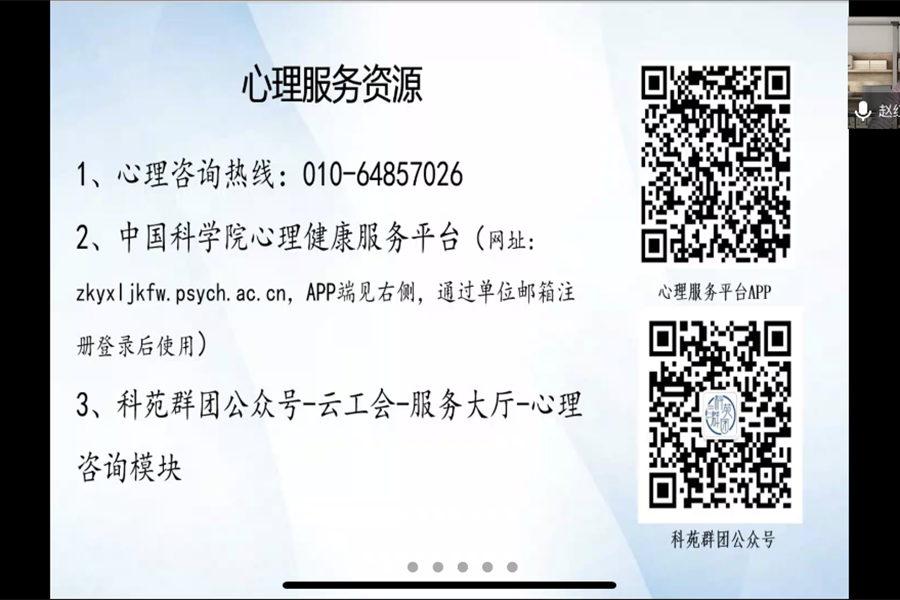此次培訓是中科院工會2021年職工心理健康主題巡講的一部分,由中科院工會職工心理健康服務中心主辦,腦智卓越中心工會承辦。趙老師娓娓道來的授課方式,拓寬心路的課程內容讓大家充滿了正能量, “活在當下”的處世理念成功植入到了每位參與培訓的職工心中。會后,職工紛紛表示將把所學知識運用到科研工作與日常生活中,在逆境中學會梳理心情,爭取成為一個擁有陽光心態、主動提升人生幸福感的人。