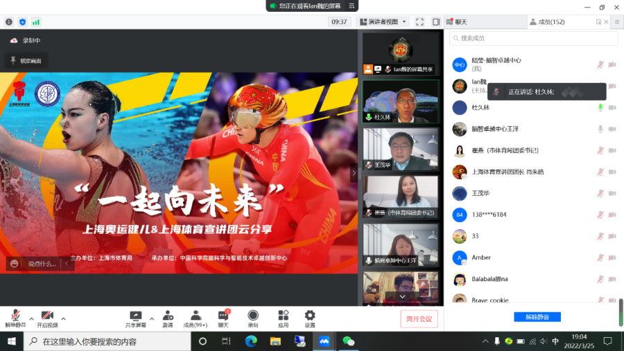 聆聽勵志故事,感受榜樣力量。2022年3月25日晚,中國科學院腦科學與智能技術卓越創新中心舉辦了“一起向未來”上海奧運健兒&上海體育宣講團云分享活動。此次活動由上海市體育局主辦,腦智卓越中心承辦。兩名上海籍奧運健兒,場地自行車兩屆奧運會冠軍鐘天使、花樣游泳奧運會亞軍、亞運會冠軍黃雪辰,以云分享的形式與腦智卓越中心師生互動。本次活動由上海市體育局團委書記崔燕主持。