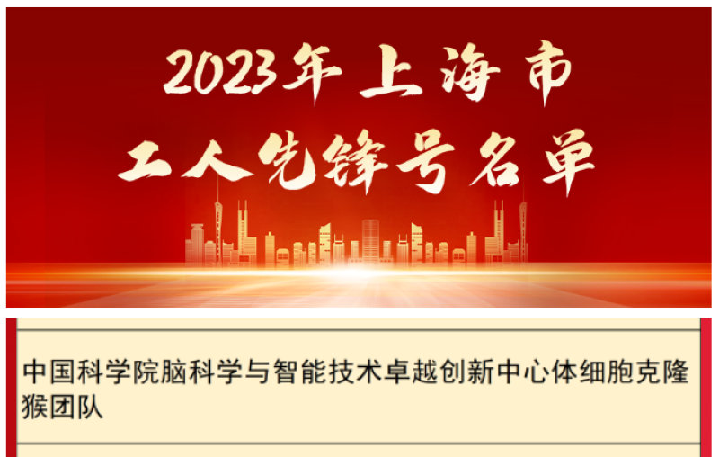 4月27日,2023年上海市五一勞動獎表彰大會在上海友誼會堂隆重舉行。會上表彰了180個上海市五一勞動獎狀,493個上海市五一勞動獎章,481個上海市工人先鋒號。其中,中國科學院腦科學與智能技術卓越創(chuàng)新中心體細胞克隆猴團隊榮獲“2023年上海市工人先鋒號”榮譽稱號。