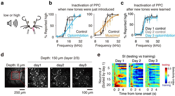 圖注:a, 聽覺二選一抉擇任務(wù)。b, 后頂葉皮層失活影響對新聲音刺激的抉擇。c, 后頂葉皮層失活不影響對已學(xué)會聲音刺激的抉擇。d, 對同一群神經(jīng)元進(jìn)行長時程鈣成像記錄。e, 同一視野中所有神經(jīng)元對訓(xùn)練(熟悉)和測試(陌生)聲音刺激之間的選擇性。選擇性指數(shù)(selectivity index, SI)基于ROC分析,SI > 0 表示偏好測試聲音刺激,SI < 0 表示偏好訓(xùn)練聲音刺激。