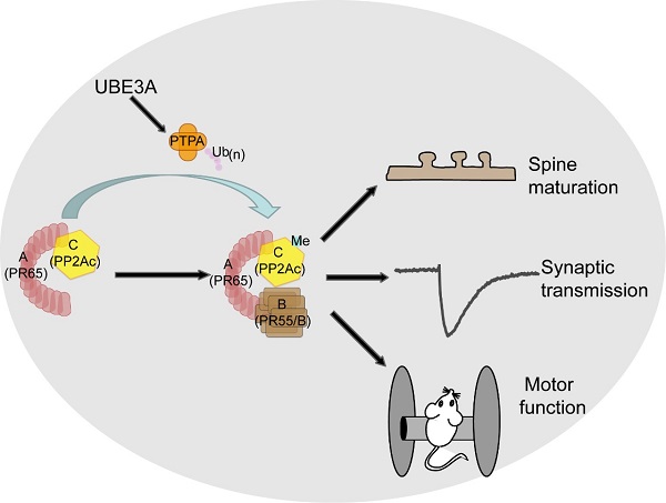 在該研究中,研究人員發(fā)現(xiàn)PP2A的活性在天使綜合征小鼠腦組織中顯著上調(diào)。相比之下,研究人員并沒有發(fā)現(xiàn)PP2A的各個(gè)亞基在蛋白水平和mRNA水平上的變化。研究者結(jié)合穩(wěn)定同位素標(biāo)記哺乳動(dòng)物氨基酸以及定量質(zhì)譜的策略,解析天使綜合征小鼠腦組織中發(fā)生變化的蛋白質(zhì)。結(jié)果顯示,PP2A的激活因子PTPA在天使綜合征小鼠中顯著上調(diào)。泛素化反應(yīng)以及質(zhì)譜分析泛素化位點(diǎn)等實(shí)驗(yàn)表明,PTPA是UBE3A的一個(gè)泛素化底物。天使綜合征小鼠模型中,PTPA的上升導(dǎo)致了PP2A催化亞基的甲基化水平上調(diào),進(jìn)而引起PP2A全酶組裝的增加,最終導(dǎo)致PP2A活性的上升。