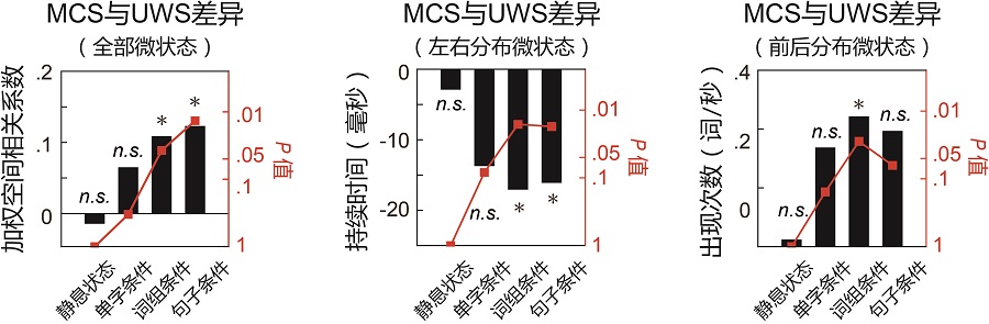3、三種腦電微狀態參數的最小意識狀態與無反應覺醒綜合征組間差異隨任務中語言層級的提升而加大