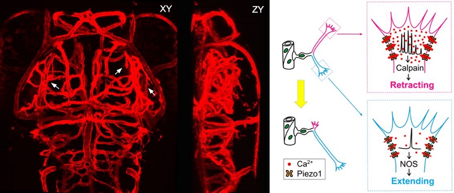 圖注:(左邊)幼年斑馬魚大腦三維血管網絡的共聚焦顯微成像圖片:紅色顯示腦血管網絡。箭頭指示內皮頂端細胞。(右邊)內皮頂端細胞的路徑選擇機制模式圖:機械敏感鈣離子通道Piezo1介導的高頻和低頻的亞細胞鈣離子活性分別通過蛋白酶Calpain或一氧化氮合酶 (nitric oxide synthase, NOS) 控制內皮頂端細胞分支的收縮或伸長,從而決定內皮頂端細胞的路徑選擇以及三維腦血管網絡的模式。