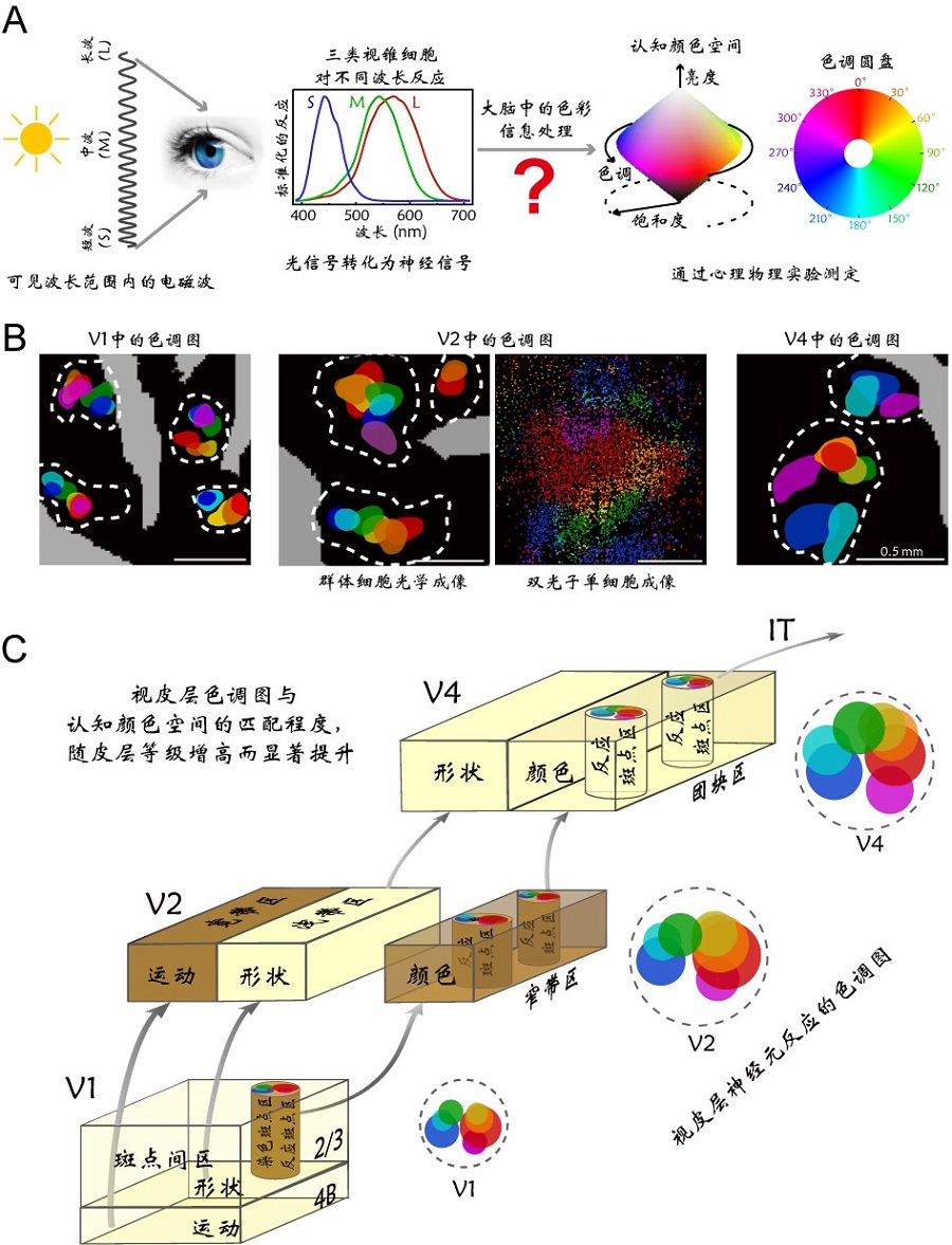 A,光的本質是電磁波,本身并沒有顏色。視網膜上的視錐細胞可將光譜信息轉化為神經信號,大腦再將這些信號加工處理最終創造出我們對顏色的主觀感知。B,本研究利用多種技術手段,描繪并分析了V1、V2、V4三個連續視覺腦區中的色調圖。C,通過定量檢測三個不同等級的視覺皮層的色調圖(調色板)與我們主觀認知的色調空間位置的匹配程度,研究者發現這種匹配程度隨著視覺皮層等級的提高而顯著提升。