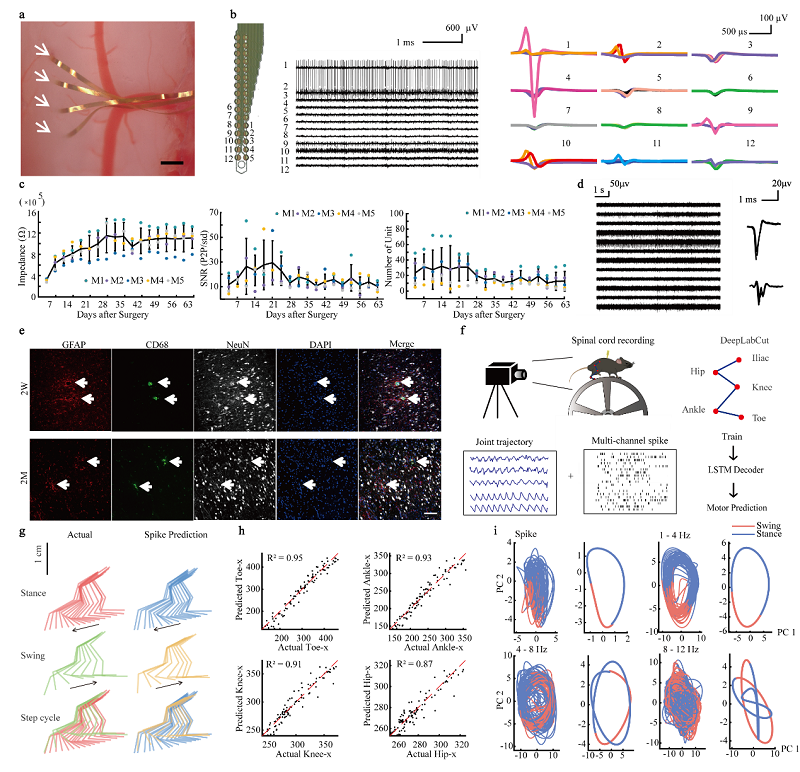圖注 (a) 超柔性脊髓界面手術圖。(b) 超柔性脊髓界面急性記錄結果。(c) 超柔性脊髓界面的9周內信號追蹤情況。(d) 超柔性脊髓界面在植入后一年后的記錄情況。(e) 超柔性脊髓界面植入誘發的免疫應答情況。(f) 脊髓神經信號解碼行為范式與解碼流程示意圖。(g) 利用脊髓內神經信號的解碼后肢運動軌跡情況。(h) 利用脊髓內神經信號的解碼準確率情況。(i) 脊髓內神經信號降維后的神經軌跡。