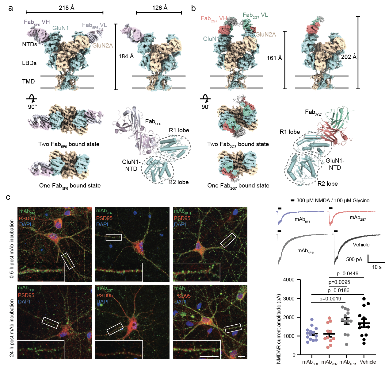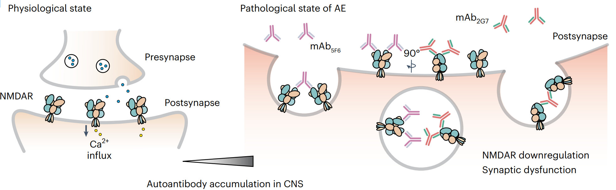 NMDA受體腦炎是一種由自身抗體介導的中樞神經系統自身免疫性疾病,是最常見的自身免疫性腦炎類型。NMDA受體是一種在大腦中廣泛分布的興奮性谷氨酸受體,是學習和記憶等認知功能的分子開關。該疾病于2018年被國家衛生健康委員會等五部門納入第一批罕見病目錄,其特點是免疫系統產生致病性自身抗體,錯誤地攻擊大腦中的NMDA受體,導致受體從神經元表面被內吞,從而減弱了NMDA受體在突觸傳遞和功能中的作用(圖1)。因此,抗NMDA受體腦炎患者通常伴有精神異常、記憶和認知障礙、癲癇發作、運動障礙、自主神經功能紊亂等多種癥狀。患者腦脊液和/或血清中的抗NMDA受體抗體是該疾病臨床診斷的分子標記物,但這些抗體結合的表位及導致NMDA受體功能障礙的機制一直是領域內的未知。