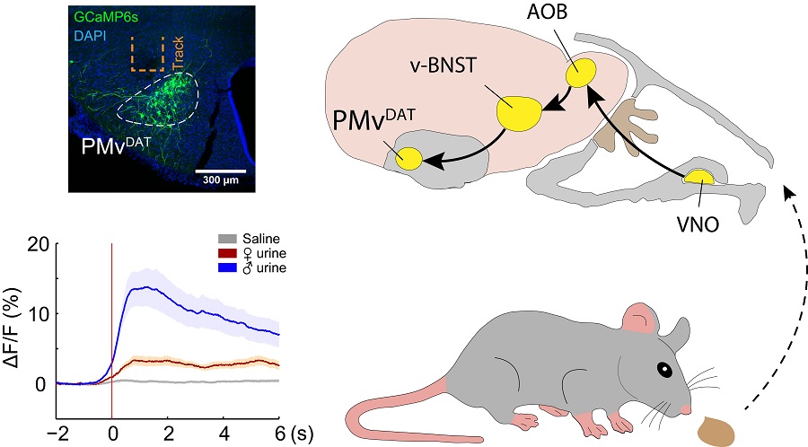 利用鈣信號記錄系統,許曉鴻研究組發現腹側乳頭體前核表達多巴胺轉運體的神經細胞(PMvDAT)在小鼠嗅聞成年雄鼠尿液時強烈響應,而對于去勢雄鼠、雌鼠、幼鼠以及大鼠的尿液則反應很小。當利用藥理遺傳學方法抑制PMvDAT神經細胞時,雄性小鼠失去對于雄鼠尿液的辨識能力,相應的,對于雄性入侵者的攻擊行為也顯著下降。而激活這群PMvDAT細胞則增加對雄性小鼠的攻擊。進一步,研究組利用陽離子通道(Trpc2)基因敲除小鼠,破壞犁鼻器的嗅覺信號傳遞,發現在基因敲除的雄性小鼠中,PMvDAT細胞對于雄性小鼠尿液的反應顯著降低,說明PMvDAT細胞整合來自犁鼻器的嗅覺信息。隨后,利用病毒示蹤,鈣信號記錄和藥理遺傳學方法,研究組發現并證實來自犁鼻器的雄性小鼠尿液信號通過腹側終紋床核傳遞到PMvDAT細胞。以上結果表明PMvDAT細胞特異性地編碼同類雄性信息,并進一步指導行為的發生。該研究解析了雄性動物相關信息傳輸至下丘腦并引起攻擊行為的細胞和環路機制,為進一步研究性別特異性嗅覺信息處理、性別特異性行為的調控以及性別感知和意識的神經基礎奠定了堅實的基礎。