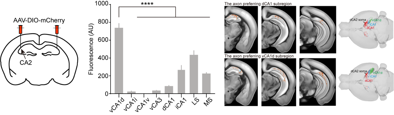 研究團隊結合單細胞全腦投射譜分析和環路示蹤實驗,發現dCA2神經元的整體輸出以長軸環路為主,到vCA1背部區域(vCA1d)的投射強度最高(圖1)。單個dCA2神經元對dCA1和vCA1d的投射強度存在明顯的差異化(圖1)。