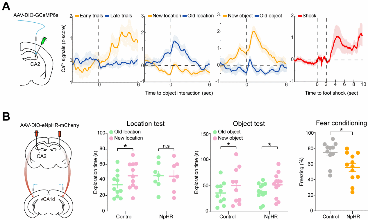 圖2:dCA2在空間和場景依賴性記憶中的作用。(A) dCA2神經元對物體接觸和足部電擊呈現特異性鈣信號反應。(B) 阻斷dCA2-vCA1d投射環路會損害物體位置記憶和場景恐懼記憶。