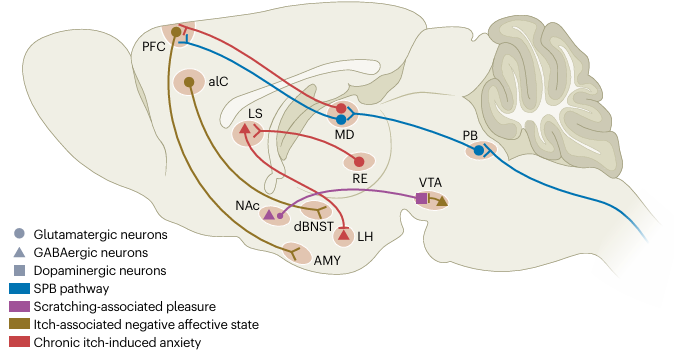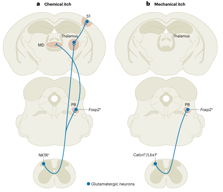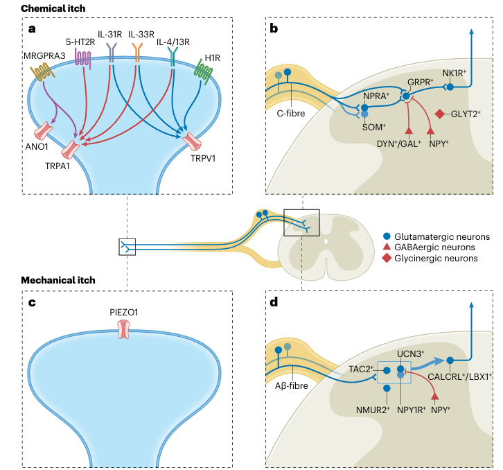 1.脊髓層面的癢覺信息處理與門控:脊髓背角存在處理化學性癢與機械性癢的微環路。脊髓背角中,表達胃泌素釋放肽受體的神經元是化學性癢信號處理的關鍵節點;而表達UCN3、神經肽Y1受體等的興奮性中間神經元群體則特異性介導機械性癢。這些通路的活動受到多種抑制性神經元(如表達神經肽Y、甘丙肽或強啡肽的GABA能神經元)的精密門控,其功能失調是導致自發癢和癢覺超敏的重要機制。