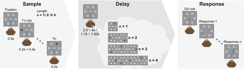 為回答這一問題,研究團隊設計了一項可變長度的序列工作記憶任務。在每個試次中,獼猴需要依次記住1、2、3或4個依次閃現的空間位置,并按順序報告(圖一)。這一任務要求獼猴不僅維持多個記憶項目,還要根據當下的記憶負荷動態地組織這些信息。
