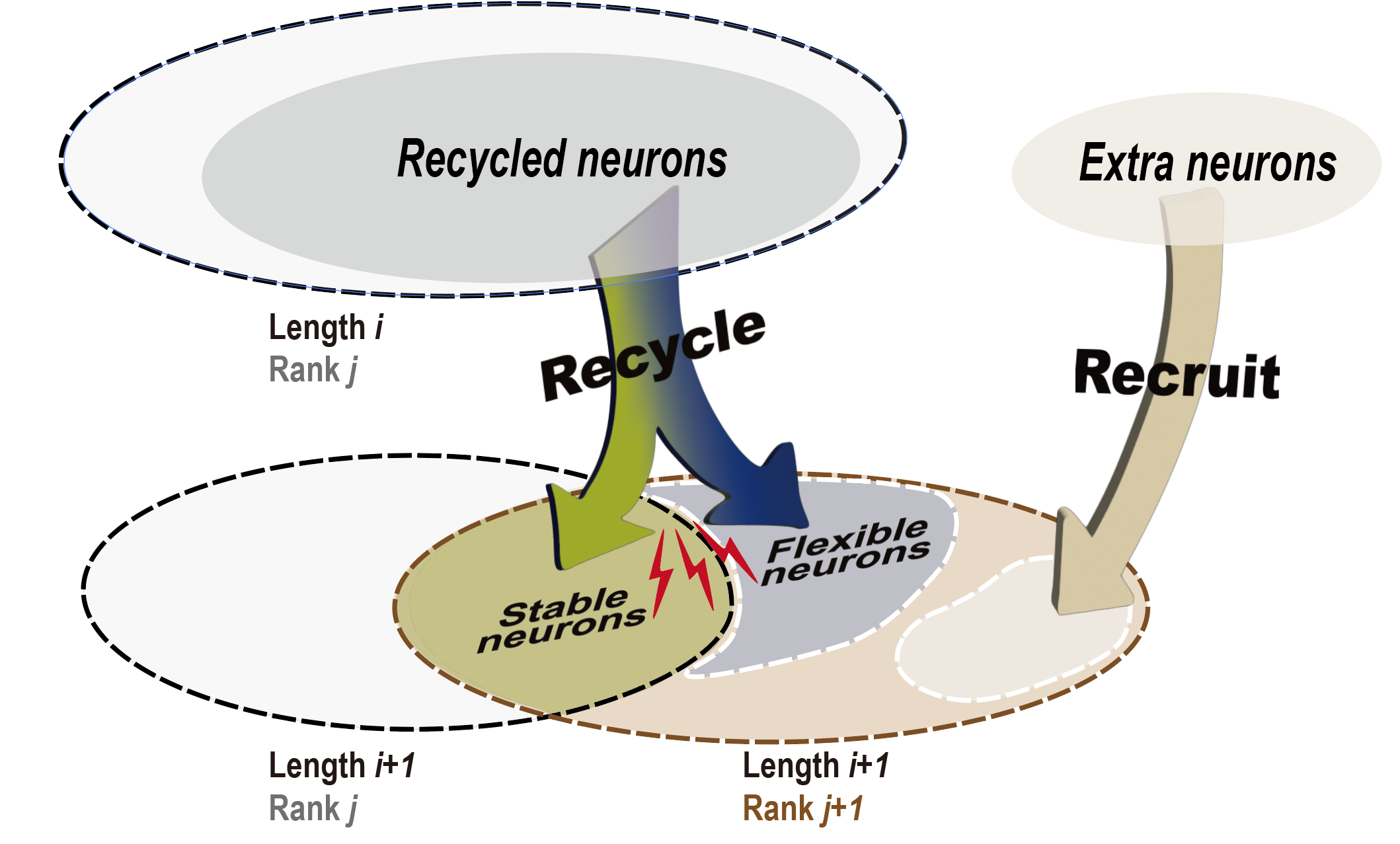 圖三:當新項目進入工作記憶時,前額葉可通過兩種方式分配資源:①招募新的神經元;②循環利用已有神經元。循環利用的神經元包括穩定型(綠,兼顧舊/新信息)和靈活型(藍,從舊信息切換到新信息)。