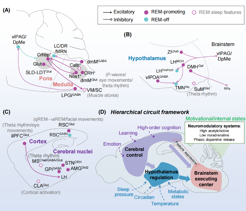 1)?腦干:核心執(zhí)行者。腦橋–延髓內(nèi)分布著多個(gè)并行環(huán)路,分別控制肌張力缺失、快速眼動(dòng)、PGO波等典型特征;這些環(huán)路之間緊密互作,共同起始與維持REM睡眠,是組織REM睡眠特征表達(dá)的關(guān)鍵。