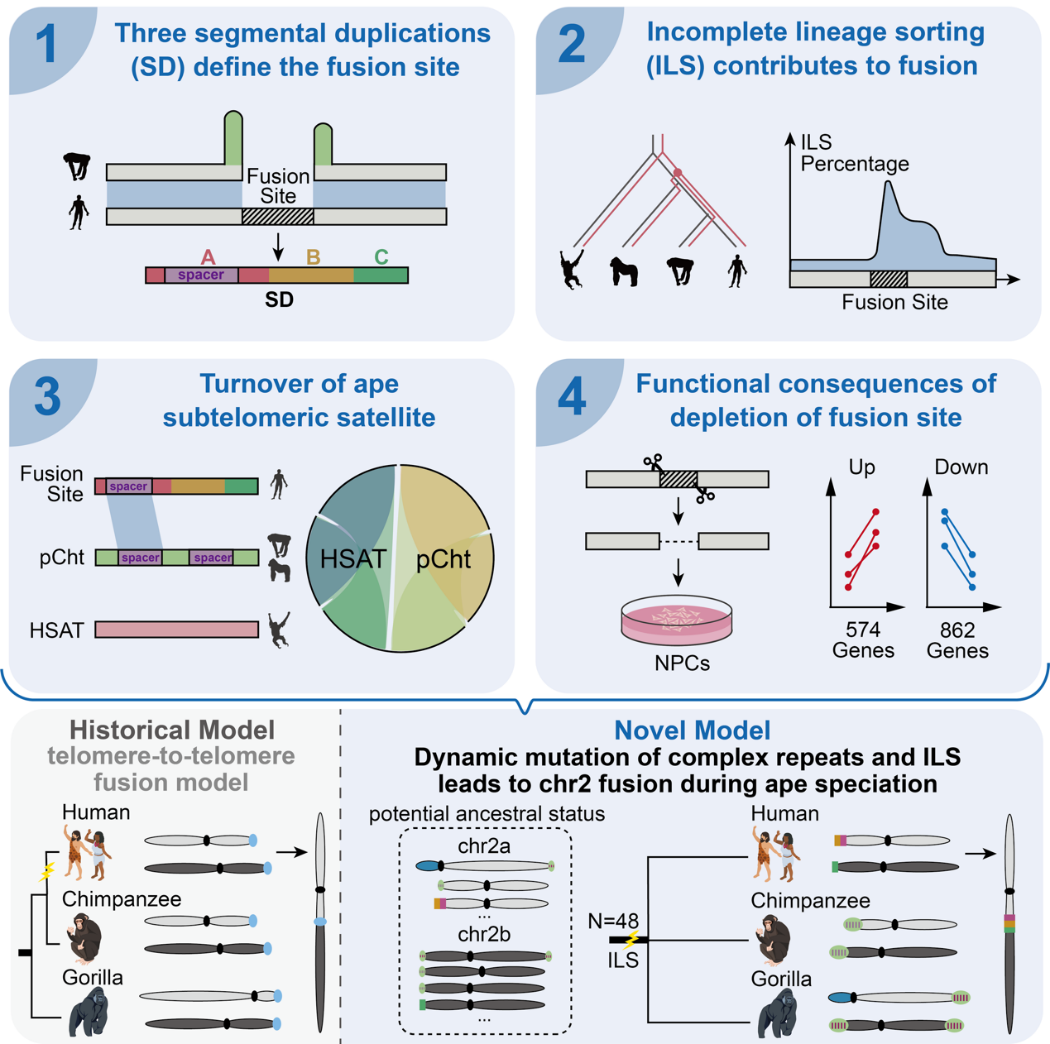 在人類與其他大猿之間,染色體數量的差異一直被視為靈長類演化中最醒目的標志之一。人類(23對染色體)相較于黑猩猩、大猩猩等大猿少一對染色體,其根源在于染色體2a與2b在進化過程中發生了“頭對頭”融合,形成了現代人類的2號染色體。1991 年,研究者在2q13–2q14區域發現反向排列的端粒重復,為端粒–端粒融合提供了最早的細胞遺傳學證據。 由于融合區域極度復雜,富含衛星DNA、轉座子以及大規模片段重復,其復雜性長期阻礙了對融合時間與形成機制的精確定義,使既往推斷跨度從90萬年至 700 萬年不等。加之早期分析手段有限,這一融合何時出現、以何種結構方式形成、是否影響了人類特有生物學特征(如大腦發育)等關鍵問題一直未得到直接證據回答。