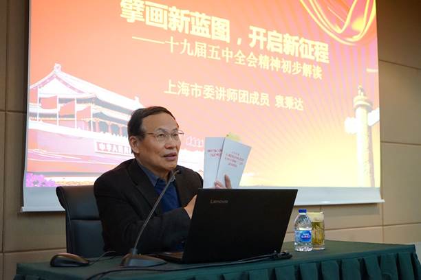 上海市委黨校馬克思主義學院教授、中共上海市委講師團成員袁秉達教授應邀作了題為《擘畫新藍圖,開啟新征程—十九屆五中全會精神初步解讀》的專題黨課報告。他從世界面臨百年之未有的大變局展開,從十九屆五中全會召開的深刻背景和重大意義、五中全會的基本精神與核心要義、2035年遠景目標和十四五規劃要點等方面切入,圍繞新發展階段、新發展理念、新發展格局三條邏輯主線,對于“十四五”時期經濟社會發展的重要任務特別是堅持創新驅動發展,全面塑造發展新優勢進行了深入分析。袁秉達教授通過理論分析、案例剖析,結合上海市的發展規劃及對“人民城市人民建,人民城市為人民”理念的踐行,結合中心實際和國家對于科技發展特別是腦科學和生命科學研究等的重視,帶領大家一起解讀了黨的十九屆五中全會精神的核心要義及其對科技創新的指導意義。